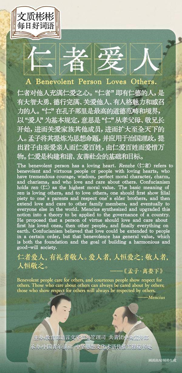 The benevolent person has a loving heart. Renzhe refers to benevolent and virtuous people or people with loving hearts, who have tremendous courage, wisdom, perfect moral character, charm, and charisma, and who love and care about others. Confucianism holds ren as the highest moral value. The basic meaning of ren is loving others, and to love others, one should first show filial piety to one's parents and respect one's elder brothers, and then extend love and care to other family members, and eventually to everyone else in the world. Mencius synthesized and upgraded this notion into a theory to be applied to the governance of a country. He proposed that a person of virtue should love and care about first his loved ones, then other people, and finally everything on earth. Benevolence is both the foundation and the goal of building a harmonious and good-will society.