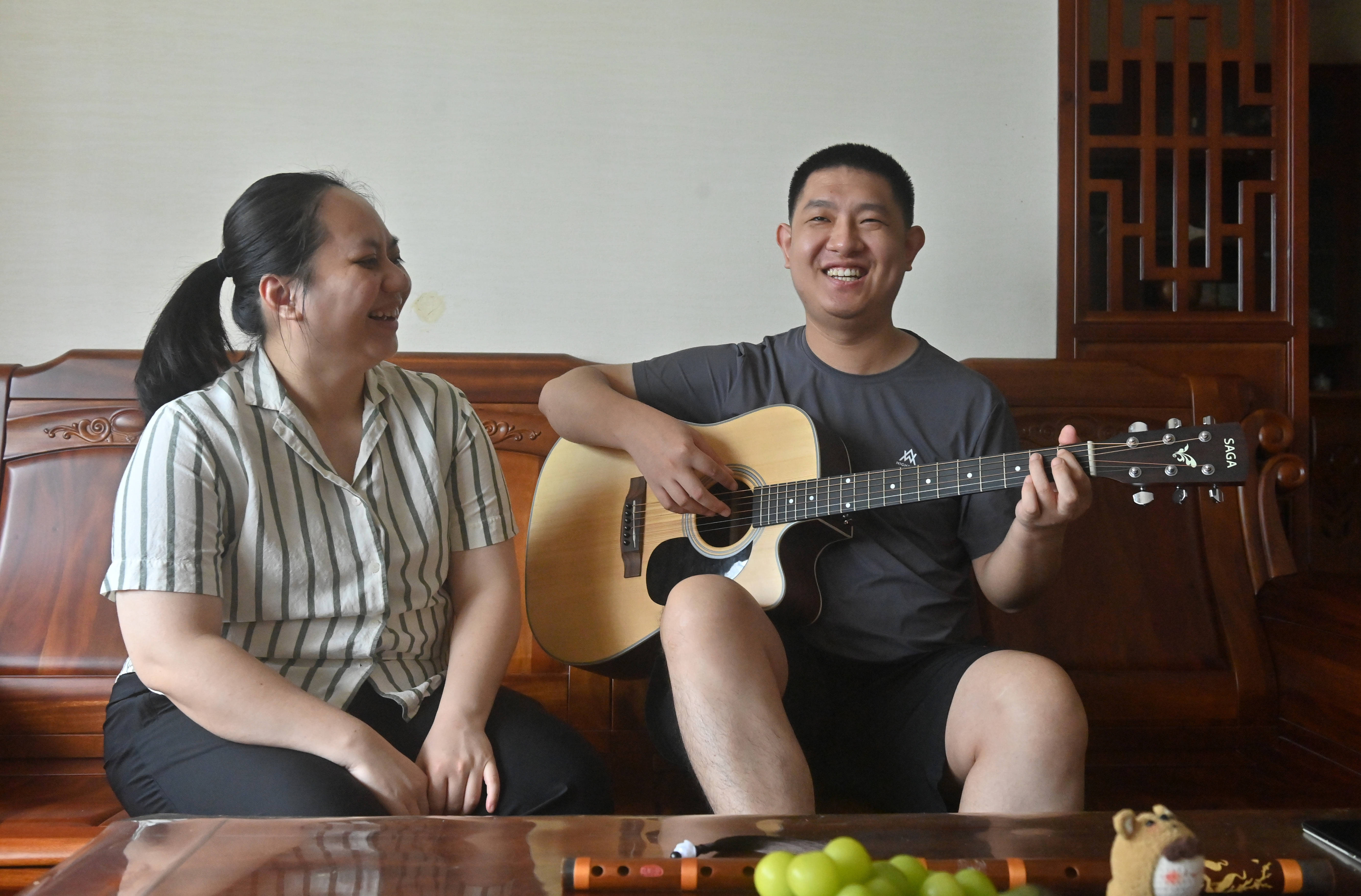 2025年8月13日,李莹(左)听爱人邵学明弹唱乐曲。邵学明是一名低视力视障人士。蓝野针是2025年我采访的第三个双目失明却迷恋写作的人。“就像峡谷中那粒顽强的种子,哪怕没有光亮指引,但只要不断奋力向上,终有一天可以破土而出,让月亮星星所看见。如果选择了放弃,我的世界将会永远留在那黑暗的峡谷中。”这是蓝野针痛彻心扉的人生感悟,也是她追逐梦想的人生感言。
