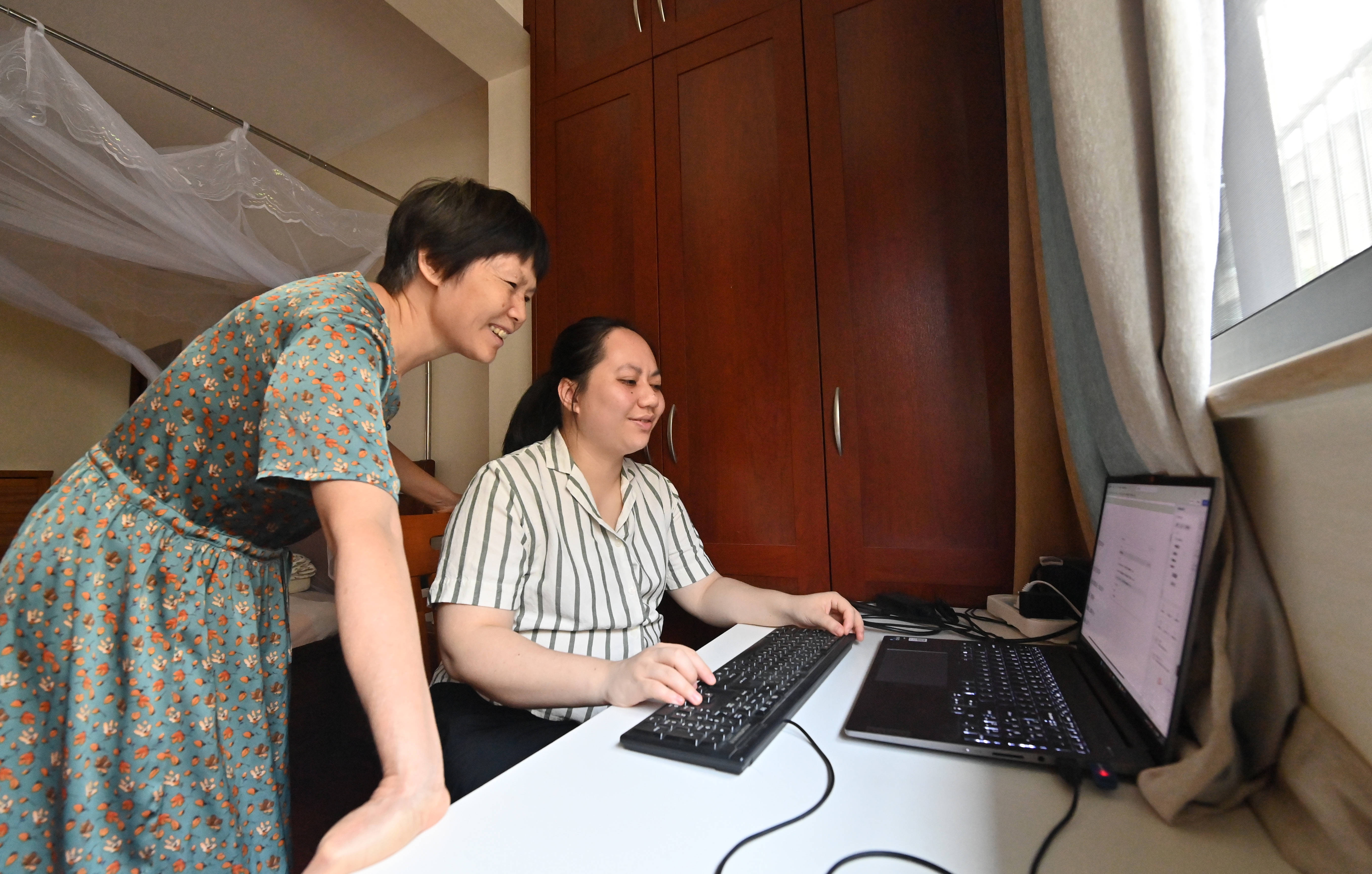 2025年8月13日,李莹(右)在妈妈的帮助下校对文稿。幸运的是,命运给李莹打开了一扇梦想的窗。“在我的许多技能都随着失明而丧失和退化时,我的文学之路却前所未有地走得又好又快。”李莹说,大学期间,她创作的一篇小说获得中国盲协征文比赛一等奖。此后,她文学创作没有停过,“我把敲下的每一个文字都当成我驰骋远方的脚步。我相信,我的天空,终会出现彩虹。”