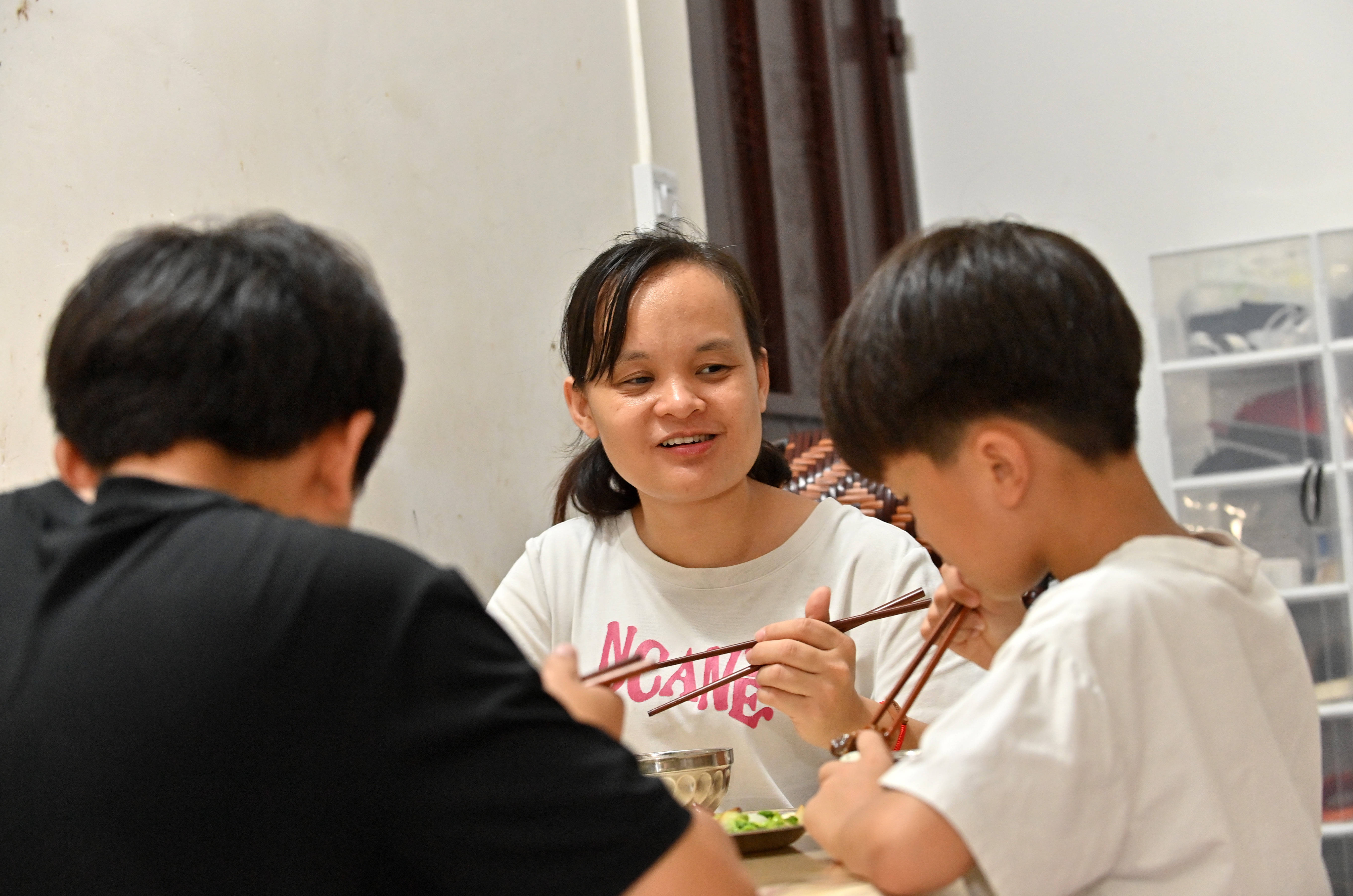 2025年10月14日,蓝野针和两个儿子吃午饭。