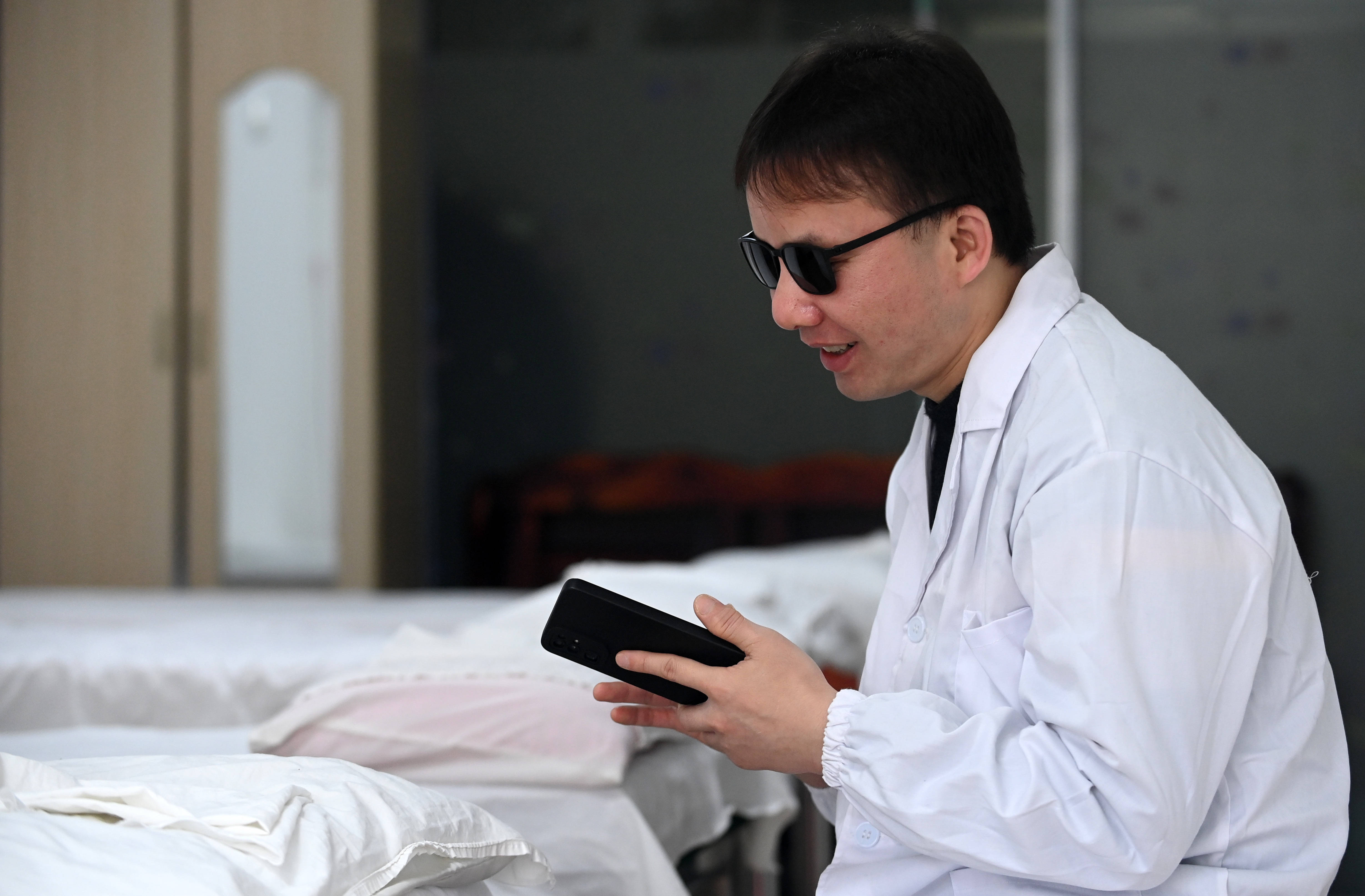 2025年2月28日,蓝宁在工作之余“阅读”文学作品。坠入命运黑暗的深渊,蓝宁历经常人无法想象的痛苦。有好几次,他想结束生命,摆脱痛苦。“但每次想到妈妈的抽泣,我又打消了念头,咬牙忍住,强迫自己接受事实、面对现实。”他回忆说。