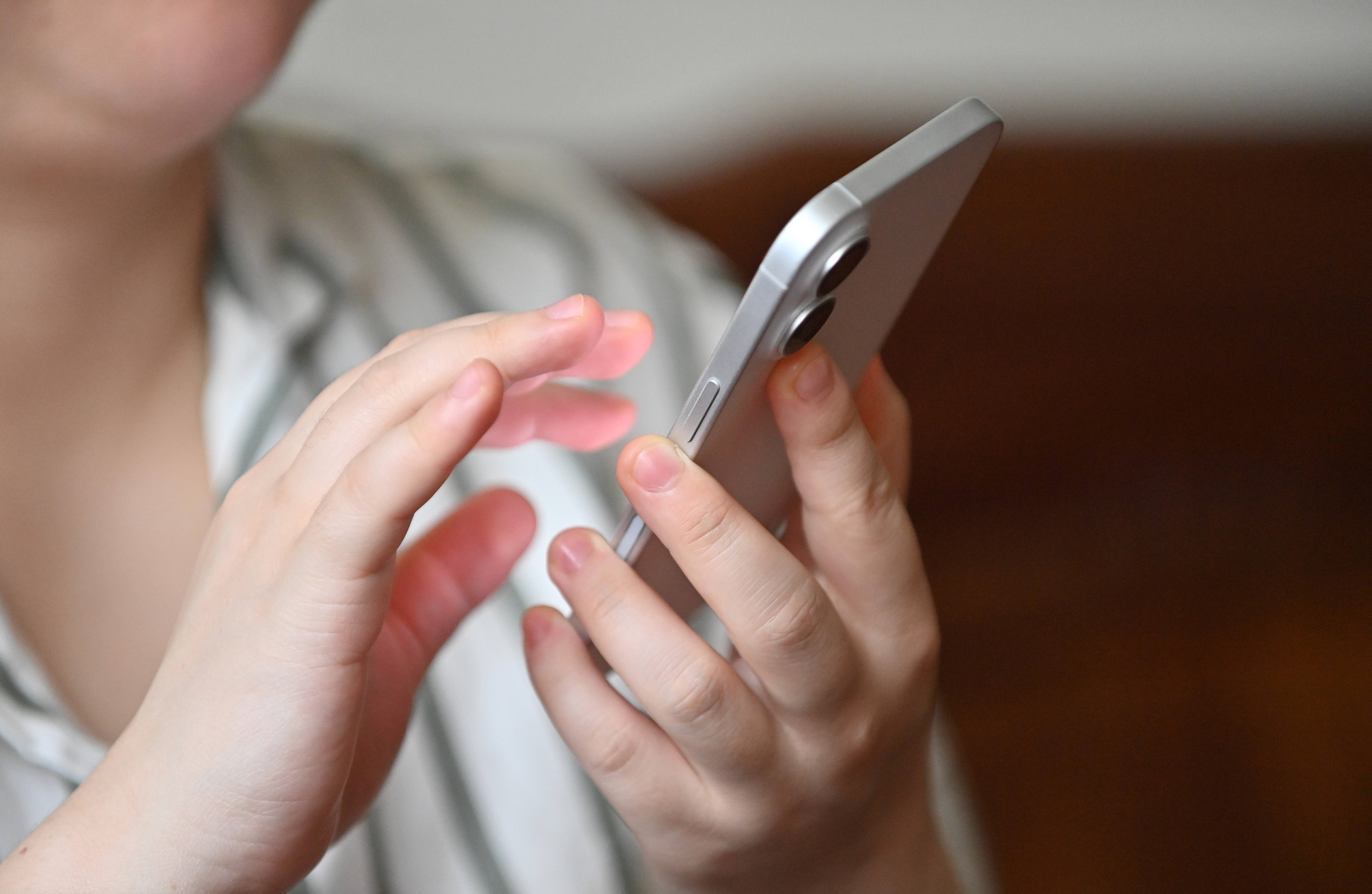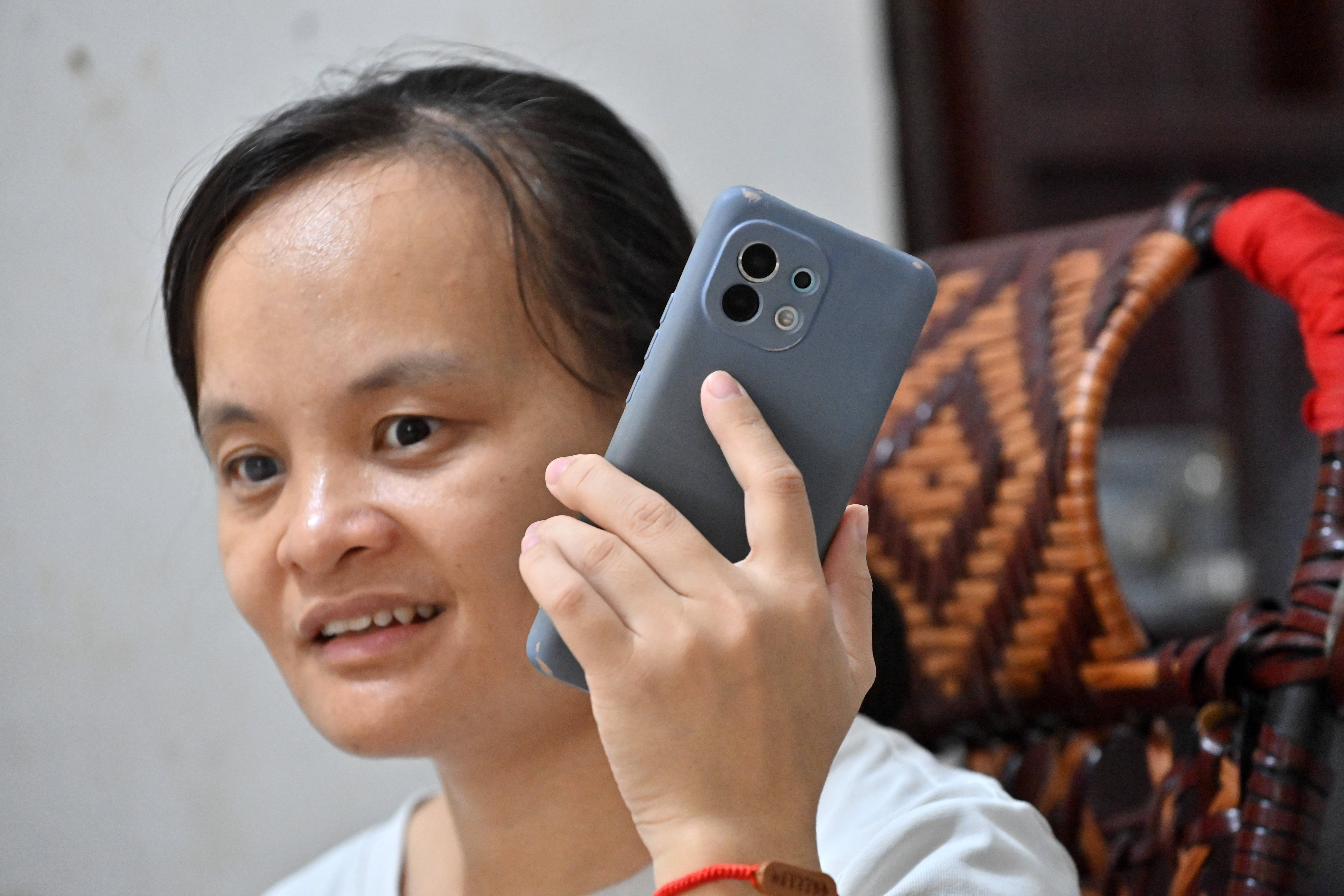 2025年8月13日,李莹在广西南宁市的家中通过手机软件听文学作品。