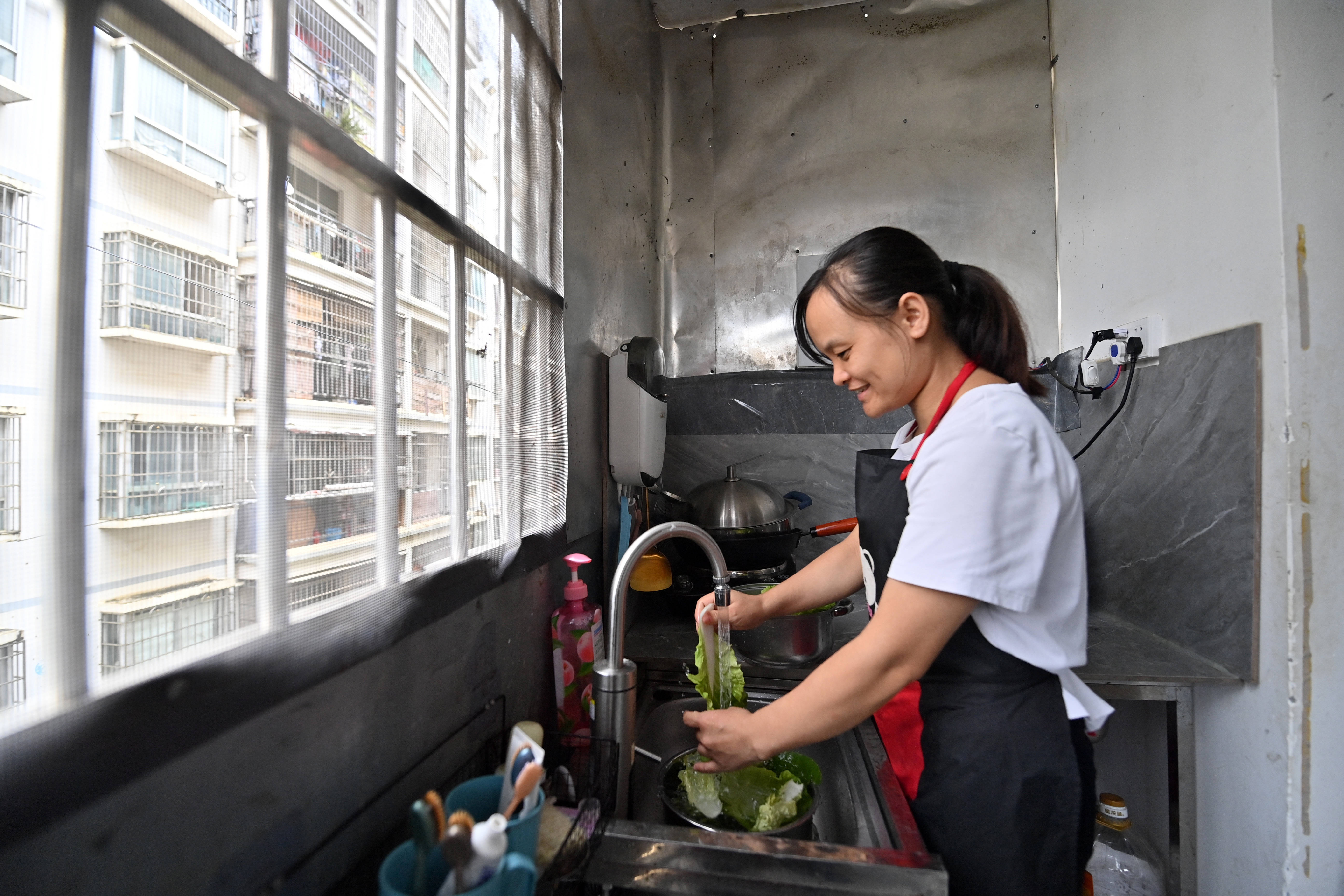 2025年10月14日,蓝野针在洗菜准备做饭。