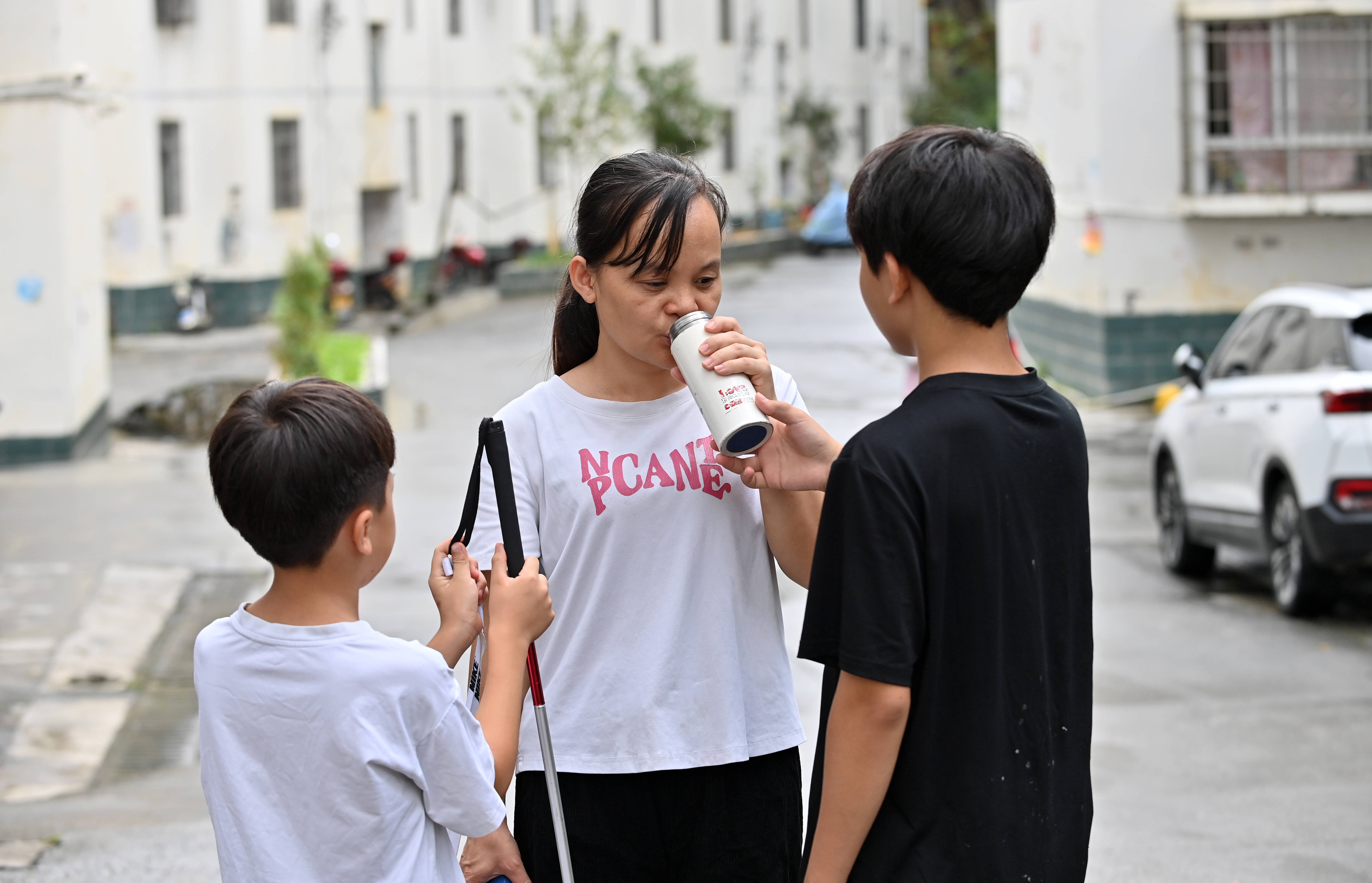 2025年10月14日,蓝野针和两个儿子在散步时喝水。幸运的是,在这段苦苦挣扎的日子里,她得到许多爱心人士的无私帮助,让她在生活和写作的路上收获越来越多的希望,她的文学作品从凤山文学微信公众号出发,越走越远,被《广西文学》《民族文学》等刊物刊发。2024年9月,她正式成为广西作家协会会员。