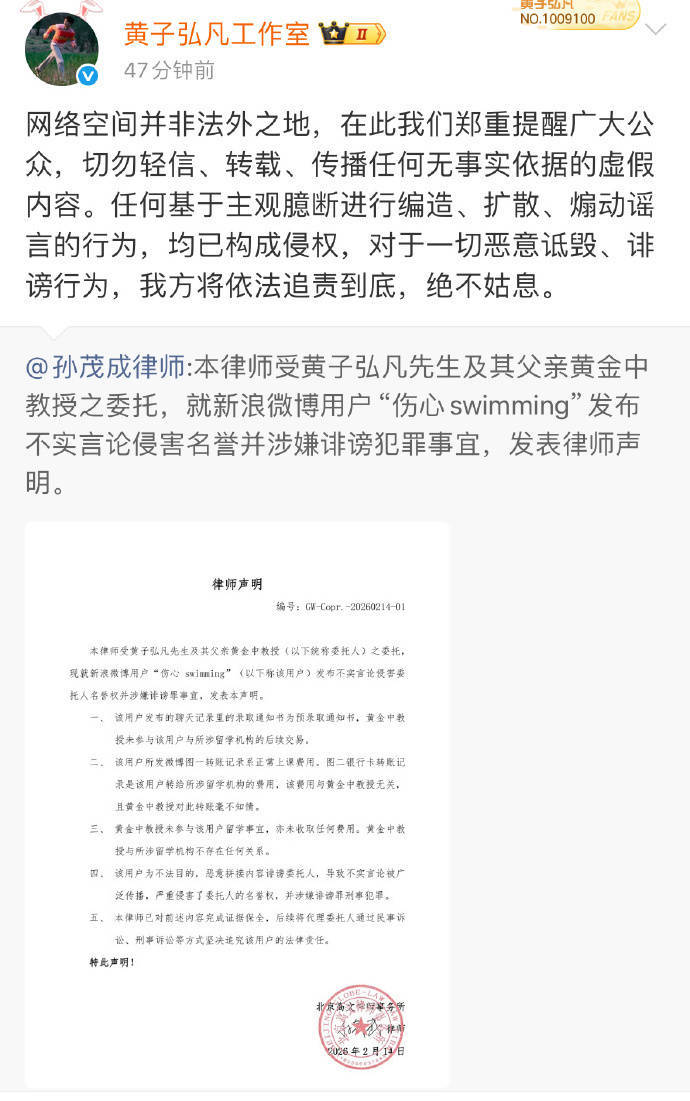 事发当晚,黄子弘凡工作室称对方所述为“不实信息和恶意造谣”;次日凌晨,工作室发布律师声明,明确黄金中未参与该用户留学事宜、未收取任何费用,与涉事留学机构无关联,将通过民事、刑事诉讼追究该用户法律责任。