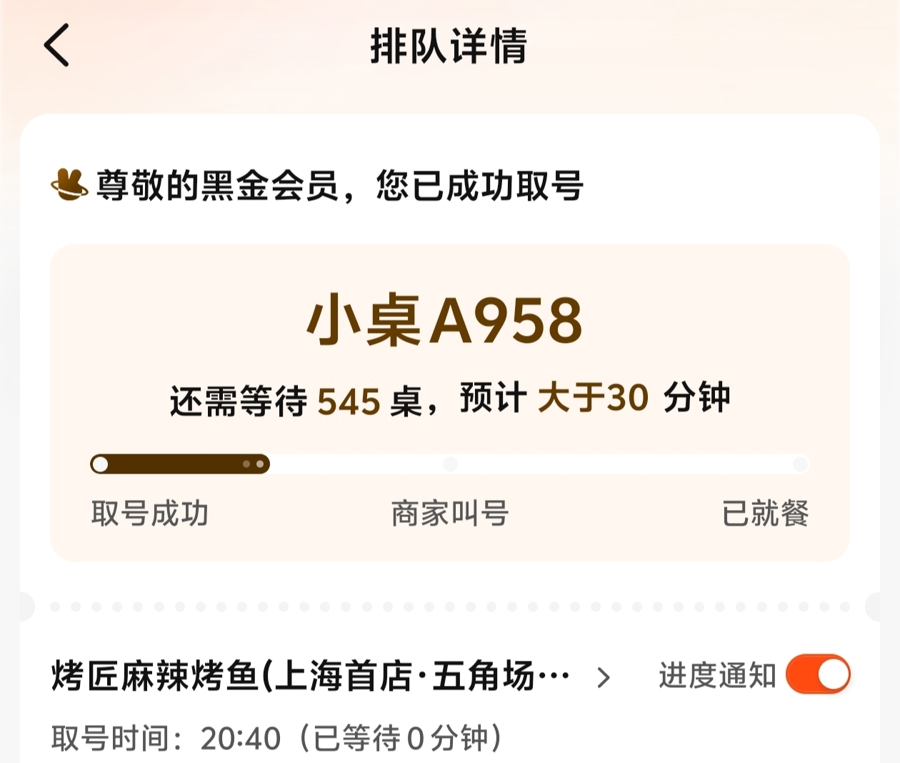 烤匠线上取号界面,工作日晚间还需等待500多桌。