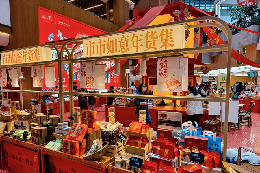 商场里竟然出现了一个石磨盘,只见一位顾客停下脚步,试着推动磨柄,芝麻的香气隐隐透出……这里是瑞虹天地太阳宫5楼的“市市如意年货集”。40余家摊位,500多件好物,共同构筑一个新春文化“体验馆”。